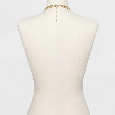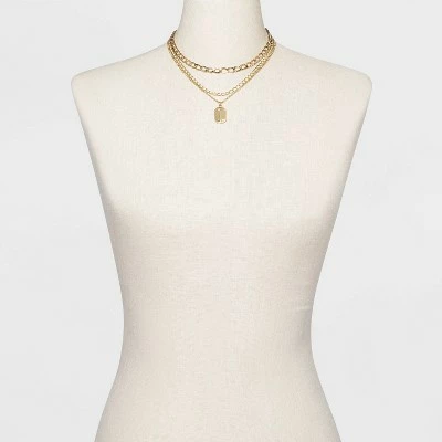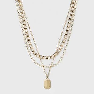 Shake up your jewelry rotation with the bold look of this 3-Row Chunky Chain Necklace from A New Day™. This short chain necklace is composed of two different chunky curb chains along with a more delicate alternating link chain to lend pleasing variation to the look. At the bottom of the more delicate chain hangs a chunky metal charm cut in an emerald shape for a jewel-like vibe that mixes edge and elegance in perfect proportion. With a lobster-clasp closure and an extender chain that lets you customize the length to your liking, this triple-row necklace is easy to pair with an array of necklines for versatile styling options you’re sure to appreciate.
