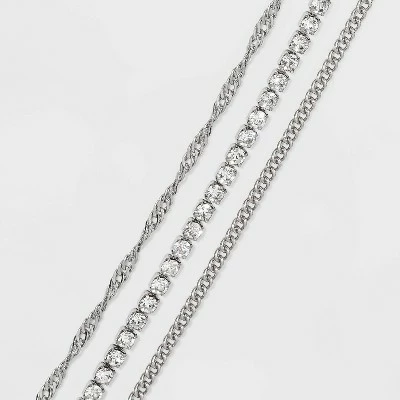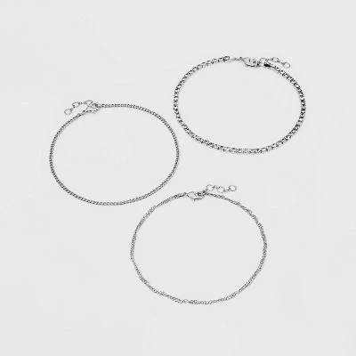 Embellish your warmer-weather wardrobe with the Twisted Curb Stone Anklet Set from A New Day™. This set includes three coordinating anklets in a dark silver tone: one with dainty rhinestones, one with simple links and one twisted curb chain. Wear each one solo or layer them together for a unique look that puts the perfect finishing touch on your ensemble, because bracelets aren’t just for wrists.