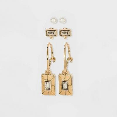 You’ll always have a chic option on hand for accessorizing your outfits with this 3-Pack Set of Fashion Earrings from A New Dayâ„¢. With faux pearl stud, gem bar stud and charm hoop styles included, this set of everyday earrings makes it easy to elevate outfits from a tee and jeans to a cute casual dress. The hoops and bar studs boast a shiny gold finish that pairs with many color palettes, and the hoops with dangling rectangular charms feature a clasp closure for convenient wear that stays put.