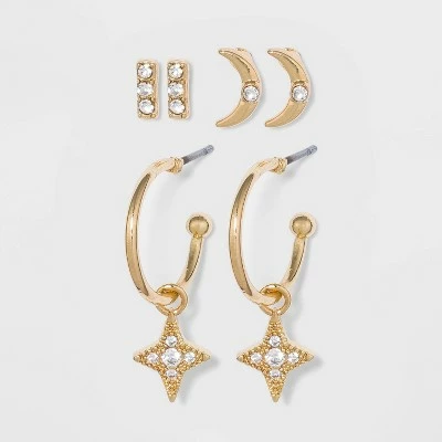 Add a dainty, celestial touch to your jewelry collection with the Three-Pair Cubic Zirconia Earring Set from A New Dayâ„¢. This set includes a pair of bar studs set with three CZ stones, small hoops with celestial charms and a pair of crescent moon earrings to round out the gold-tone earring set. The coordinating styles mean it’s easy to pair them up for multiple lobe piercings, and they also look great solo for the perfect minimalist jewelry vibe.