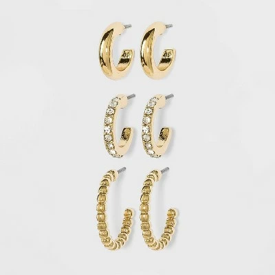 This Hoop Earring Set from A New Day™ is the perfect way to add some dainty charm to your jewelry collection. This set includes three pairs of small hoop earrings in different styles to suit your every mood, and they’re all set on post hardware with butterfly backs for secure, easy wear. Included are a pair of small chunky hoops, a pair of hoops with CZ accents and a pair of hoops formed in a bead-like style for a simple yet classic look. The coordinating styles mean it’s easy to pair them up for multiple lobe piercings, but they also look great solo when you’re feeling like minimalism is the way to go.