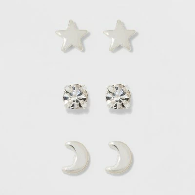 Show off your celestial style with the Star, Moon and Cubic Zirconia Earring Set from A New Dayâ„¢. Featuring three pairs of dainty studs, this set includes glimmering round-cut CZ, crescent moons and little stars evoking the magic of the night sky. Wear them together or mix and match to your heart’s content!