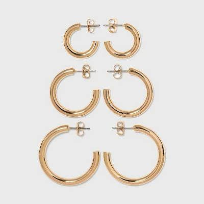 Add classic style to your jewelry collection with the Pipe Hoop Earring Trio Set from A New Dayâ„¢. This set of earrings comes with three pairs of open hoops, each in gold-tone metal with a sleek finish for simply elegant shine that’ll work well with any look, from a tee and jeans to a cocktail dress. With three different sizes of hoops to choose from, you’re sure to have a pair suitable for every occasion. Post backs make the earrings easy to put in and take out while staying secure in your ear, and nickel-free metal makes them a great pick even for those with sensitive ears.