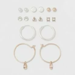 Two Spheres, Two Circles, Flower, Pearl, Green Stone & Bow Stud Earring Set 8pc – A New Day™ Gold