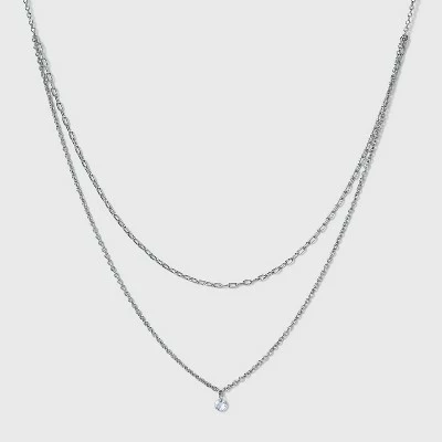 Get refined, subtle adornment with the Silver Plated Paper-Clip Chain Cubic Zirconia Layered Necklace from A New Day™. This layered chain necklace is comprised of one delicate paper-clip chain attached to a fine curb chain for a layered look that’s easy to wear but skips the tangle of sporting multiple necklaces. Each chain is rendered in a high-polish silver-plated finish for a bright glow, and the pierced CZ charm lets the light pass through the whole gem for extra sparkle. With a spring-ring closure and an extender chain that lets you customize the length to your liking, this double-row necklace is easy to pair with an array of necklines, letting you style this delicate necklace with a range of items in your wardrobe.