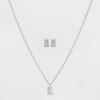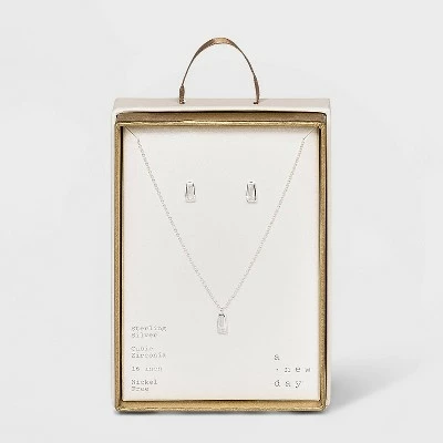 From dinner dates to parties to routine daily outfits, this Sterling Silver Rectangle Cubic Zirconia Necklace Earring Set from A New Day™ will help you accessorize in simply elegant style. This sterling silver jewelry set includes a rectangle cubic zirconia pendant as well as matching earrings for a coordinating look you’ll love flaunting. Made with nickel-free metal, this stone-studded necklace and earring set suits all skin types whether you wear them together or pair with other jewelry in your wardrobe.