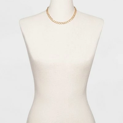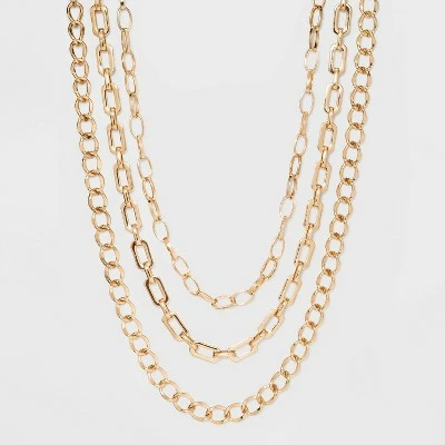 Elevate your look in one fell swoop with the Three-Piece Metal Chain Link Necklace from A New Dayâ„¢. The multi-strand necklace in gold tone is made of three individual strands of chunky chains in different styles to complete your outfit in statement style. It has a shorter, oval-link chain sitting on the inside of a longer rectangle-link chain, while the outermost chain is made of wavy round links. The three strands of this chunky chain necklace can also be worn separately for a little pared-down effect. Wear the multi-strand look with an evening turtleneck dress, and sport a single strand on your crewneck tee for easy daytime wear.
