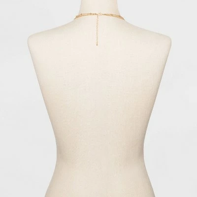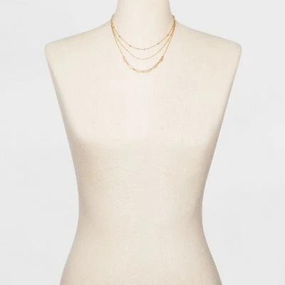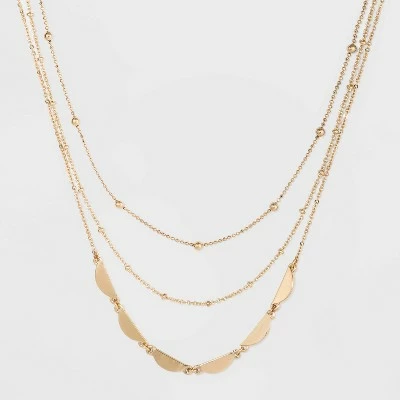 Drape your neck in style with the Three-Row Layered Necklace from A New Dayâ„¢. Fashioned in elegant gold tone, this multilayered short necklace features three slender chains cascading downward, creating a mesmerizing appearance that you’ll love. The top beaded chain is accented with large beads spaced evenly along its entire length, the middle cable chain features golden beads at intervals, while the bottom layer has scalloped half-moon pendants at the center front. The layered chains fasten together at the center back with a lobster claw clasp, along with an extender chain for a conveniently adjustable fit.