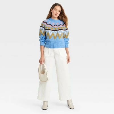 Your winter-weather look just got brighter and sportier with the Crewneck Sweater from A New Day™. Fashioned in a solid hue, this sweater-knit pullover for women is adorned with a vibrant Fair Isle pattern on the upper half of the front, back and sleeves to elevate the season’s classic style. The heavyweight knitwear is cut in a standard-fit silhouette with a below-waist hemline that helps keep you comfy and cozy during any activity. It has raglan long sleeves, a crew neckline and ribbed edges for a chic look you’ll love to pair with all of your favorite bottoms.