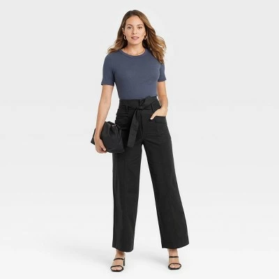 Keep your days fun and fashionable with the High-Rise Wide-Leg Paperbag Pants from A New Day™. These solid-hued pants are tailored in a casual, flared-leg silhouette with a soft and stretchy fabric-blend construction to keep you in relaxed, breathable comfort no matter where you’re headed. A high-rise paperbag waistline with belt loops and a zip fly shapes the stretchy pants for a figure-flattering look, which is taken up a notch by the matching sash-tie belt. The utility-inspired front and back pockets give a handy spot for stashing small essentials, while the stitched-seam crease running down the front center of each leg lends added definition to the full-length pants. Tuck in a shirt or tee, or pair with a crop top, and complete your look with heeled or flat sandals or sneakers.