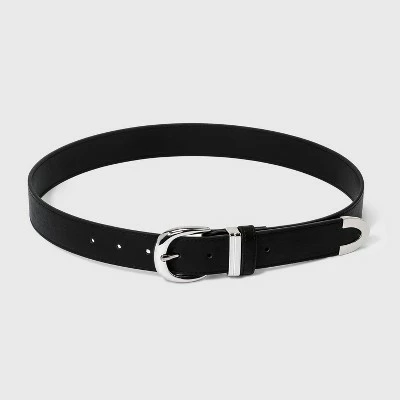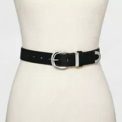 The Trouser Belt with Metal Loop from A New Day™ is a simple yet stylish wardrobe essential. In a versatile black hue, this women’s faux-leather belt features a simple belt band that helps creating a polished look, and has a D-ring buckle gleaming in silver tone metal, paired with a complementing belt loop and end tip for plenty of shine and style. The adjustable belt lets you create a secure fit, whether you wear it with a printed dress, linen shorts or jeans with tucked-in tops and more.