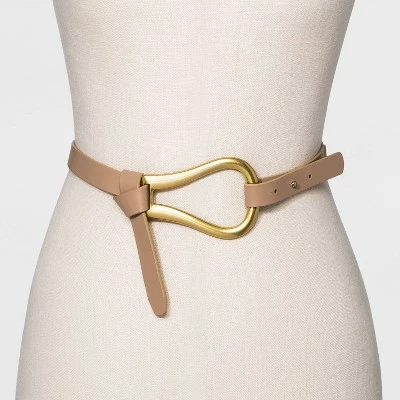 From casual everyday dresses to smart formal wear, accessorize your look with this Waist Self-Tie Belt from A New Day™. Sporting a neutral solid hue, this skinny self-tie belt features a U-shaped metallic buckle in a smooth gold finish for a stunning contrast. Versatile enough to be worn over anything from an oversized T-shirt to a one-piece dress to an open cardigan for a more fitted shape, this stunning waist belt will make a great addition to casual everyday looks and more dressed-up occasions alike.
